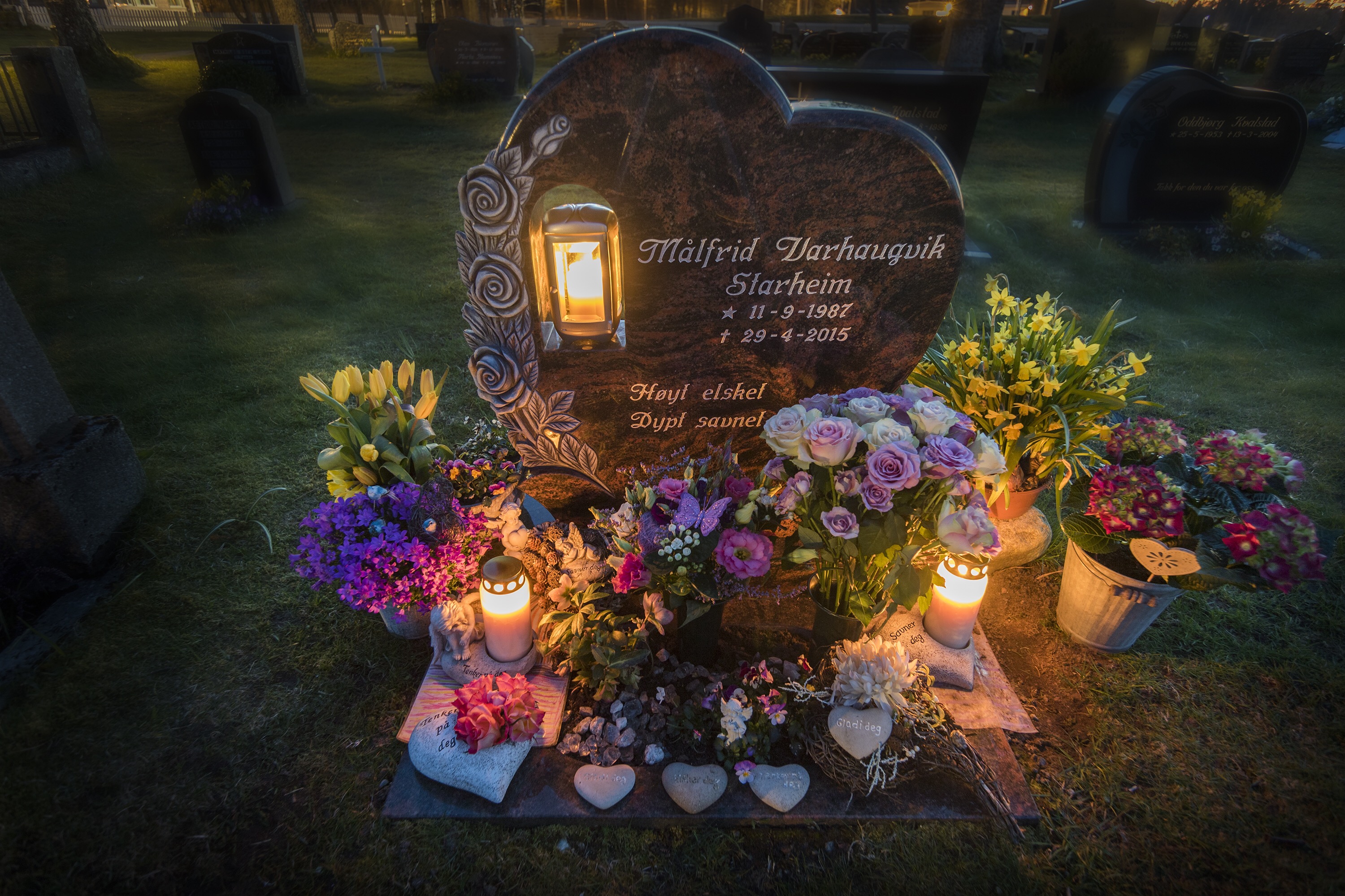 Når jeg var yngre følte jeg en viss redsel for gravplasser, spesielt når det var mørkt ute. Nå føler jeg det er en av de mest fredfulle steder å være. Lørdag var hele familien på gravstedet for å pynte med blomster og lys. På kvelden, etter mørket hadde senket seg, tok jeg turen tilbake for å se. Graven var så vakker med blomster og levende lys. De var tydelige symboler på kjærlighet og savn!